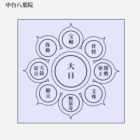 中台八葉院の八葉の花弁に当たる部分には、密教で特に重要視されれる四仏と、八大菩薩のうち四菩薩(普賢、観音、文殊、弥勒)が配されています。残りの四菩薩(虚空蔵、金剛手、除蓋障、地蔵)は十二院の中に配されています。観音と文殊は重複していますが、両菩薩は各院の主宰者を兼務していると考えられます。