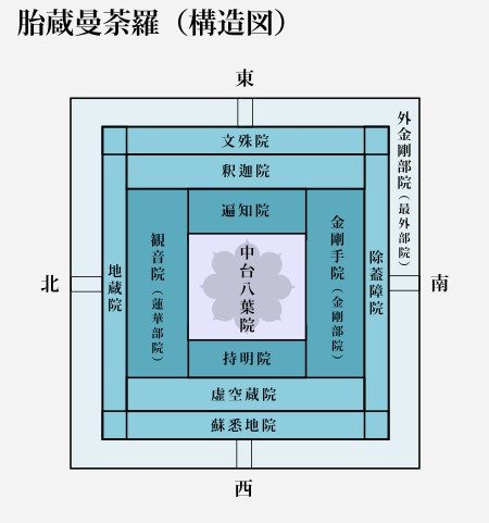森雅秀『マンダラの新しい見方』は、胎蔵界曼荼羅について、「中心の大日如来からスタートして、放射状に次々とメンバーを増やしていったと見れば、仏の世界の構造としてはイメージしやすいであろう」と述べています。