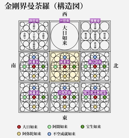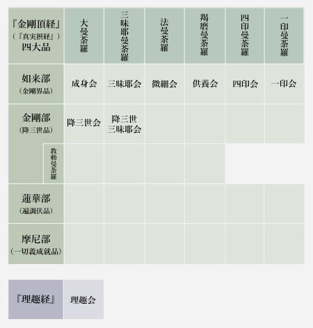 胎蔵曼荼羅は仏部、蓮華部、金剛部の三部を基本として発達したのに対し、金剛界曼荼羅は『金剛頂経』(初会金剛頂経)の四大品から、如来部(金剛界品)、金剛部(降三世品)、蓮華部(遍調伏品)、摩尼部(一切義成就品)の四部からなるとされます。