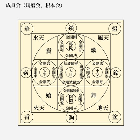9種の中で特に重要なのが中段の中央にある成身会だとされ、根本会とも呼ばれます。成身会が金剛界曼荼羅の基本であり、残りは成身会を展開した変形や省略形であると言えます。