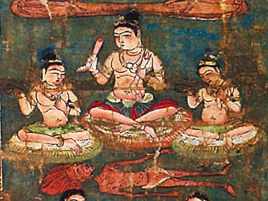 問題となるのが外金剛院で、ここには諸天が配されています。諸天はそもそも異教の神々を仏教に取り入れたものなのですが、この中にはダーキニー(荼吉尼)と呼ばれる、シヴァ神に仕えていた魔女まで含まれています。現図曼荼羅においてもダーキニーは南門のやや下あたりで、人間の足をむさぼり食っている姿で描かれています。