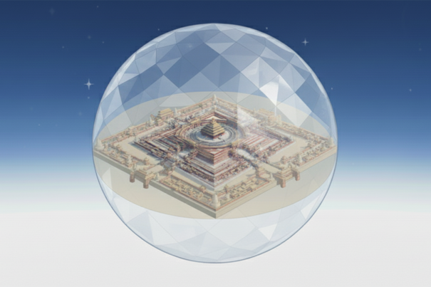 その巨大な楼閣には、ありとあらゆる如来たちが参集している。当然ながら、立体である。もう少し正確にいえば、巨大な楼閣は、透き通った金剛(ダイアモンド)製の金剛籠という名のバリヤー(防御膜)で完全におおわれている。したがって、全体のかたちとしては球体となる。